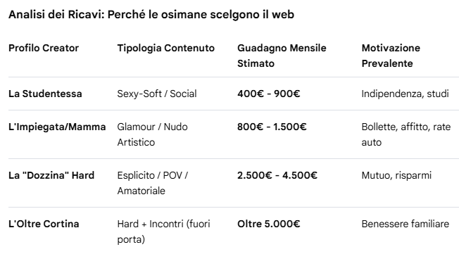 Nostra inchiesta: sono non meno di 30 le osimane di ogni età che, nell'ombra digitale, trasformano la propria routine erotica in business. Dalle commesse gentili alle impiegate insospettabili, il fenomeno rompe ogni cliché generazionale coinvolgendo donne dai 18 fino ai 60 anni. Una svolta pragmatica sostenuta spesso tra le mura domestiche da mariti che, tra complicità e pragmatismo, si riscoprono tecnici, manager o perfino "cuck" felici di massimizzare il successo economico e il sexy appeal delle proprie mogli e compagne