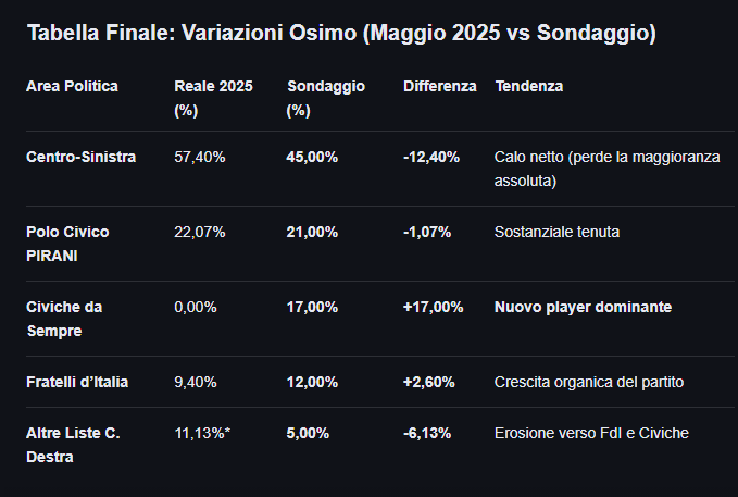 L’analisi delle Liste Civiche certifica la resilienza granitica dei Civici da sempre, nonostante l'astensione del 2025. Tuttavia il calo della Glorio (quotata al 45%) non riapre i giochi: con il quorum abbattuto presumibilmente al 40%, la Sinistra vincerà ancora e sempre. Il grazie di Osimo al miope ostruzionismo dei Piraniani che, dopo aver abbattuto l'Amministrazione nel 2024, continuano ad impedire un fronte politico comune, regalando la città agli avversari fino al 2035